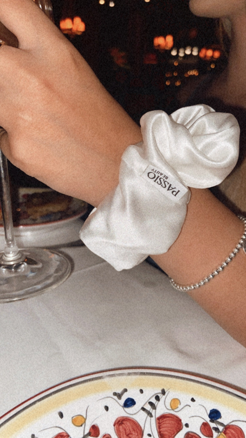 100 % mulberry silk scrunchy holds hair up without tangling, denting or creasing, reduces breakage. Silk helps your hair avoid friction damage.